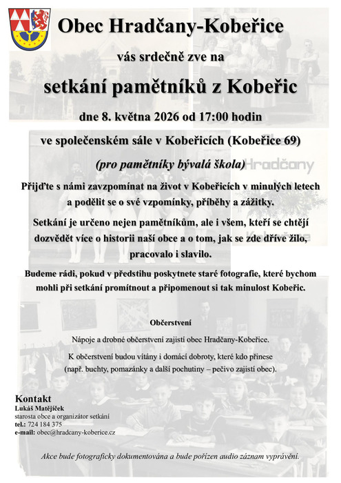 Obec Hradčany-Kobeřice vás srdečně zve na setkání pamětníků z Kobeřic dne 8. května 2026 od 17:00 hodin ve společenském sále v Kobeřicích (Kobeřice 69) (pro pamětníky bývalá škola).